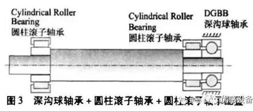 3)深沟球轴承+圆柱滚子轴承+圆柱滚子轴承配置:电机驱动端采用深沟球轴承+圆柱滚子轴承,深沟球轴承与轴承室径向为间隙配合,并用O型圈防止轴承外圈转动,非驱动端采用圆柱滚子轴承,如图3所示。优点是轴伸端可以承受一定的轴向载荷及径向重载荷,轴向不需要预紧、非驱动端可以接受电机转子的热膨胀量,缺点是电机的噪声较大、其轴承损坏的概率较高(与两轴承配置相比)。此配置多用于大型电机。