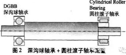 2)深沟球轴承+圆柱滚子轴承配置:电机驱端采用圆柱滚子轴承、非驱动端采用深沟球轴承定位,如图2所示。优点是轴伸端可以承受重载荷,电机不需要轴向预紧及预留转子的轴向热膨胀间隙;缺点是较两个深沟球轴承配置的噪声略高、允许的转速略低,负载必须接受轴向膨胀。此配置适用于大中型电机,在驱动端有重载荷。