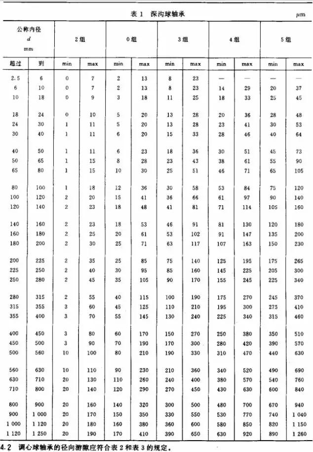 注:小伙伴凭轴承类型以及内径大小以及游隙等级,对应到相应的表格查询轴承游隙的标准值。
