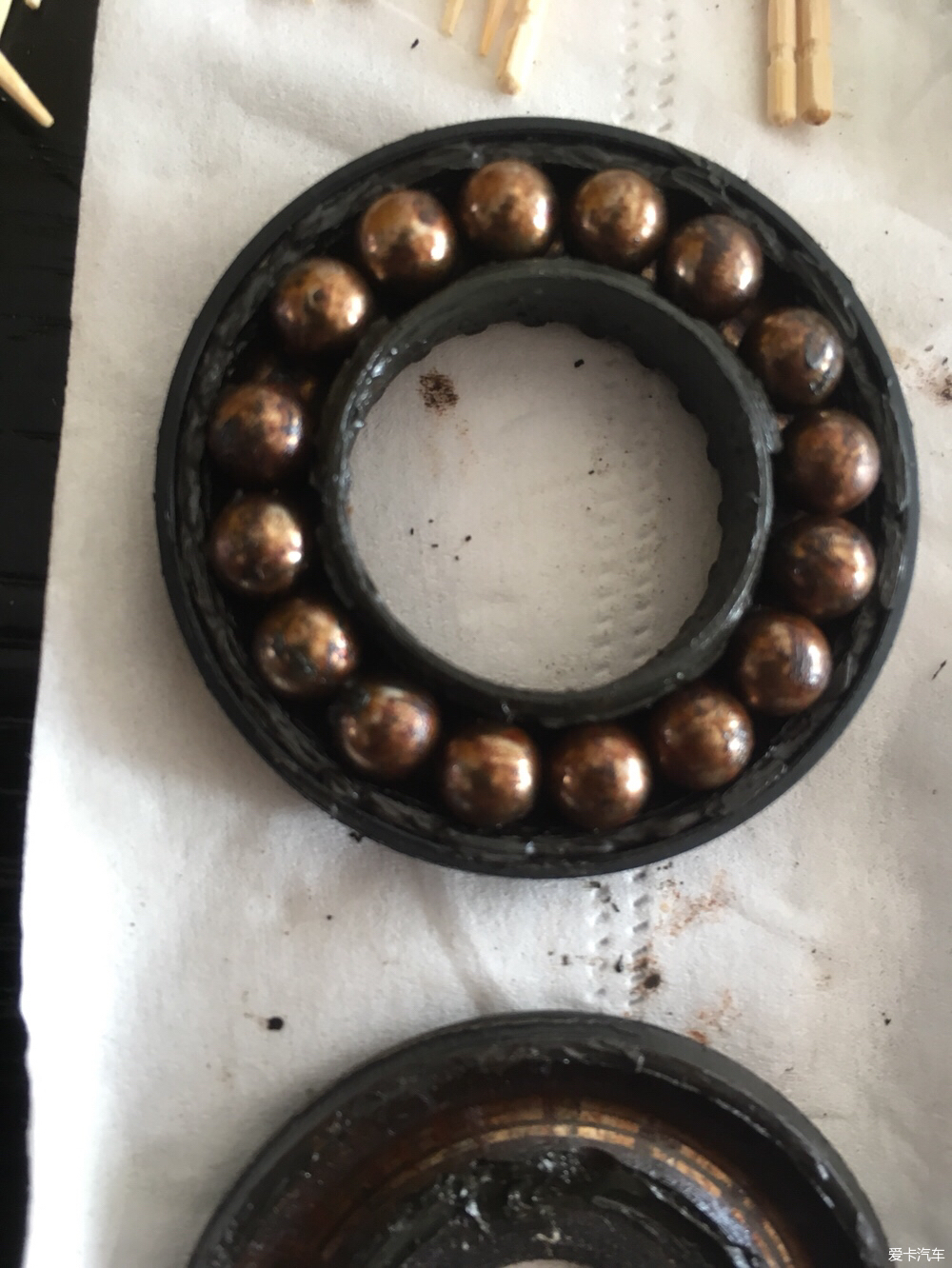 第二遍擦拭,缝隙里用牙刷清理干净 擦的一尘不染。可以注意下这个原车平面轴承的标示 下面有网购的