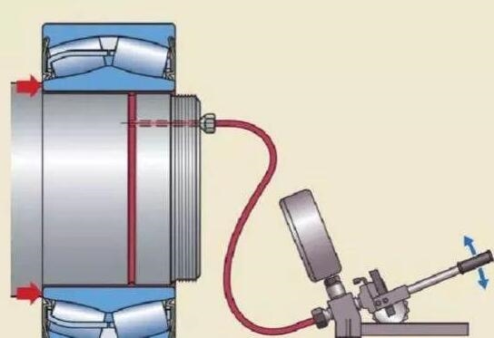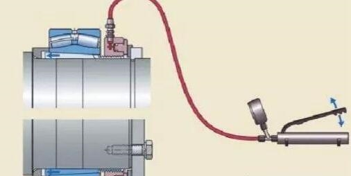 使用注油法时,中大型轴承的拆卸会更加安全简单。这种方法在高压下通过油孔和油槽将液压油注入两个圆锥形配合面之间。两个表面之间的摩擦大幅减少,并产生使轴承和轴径分开的轴向力。