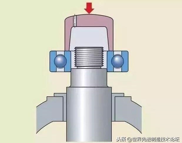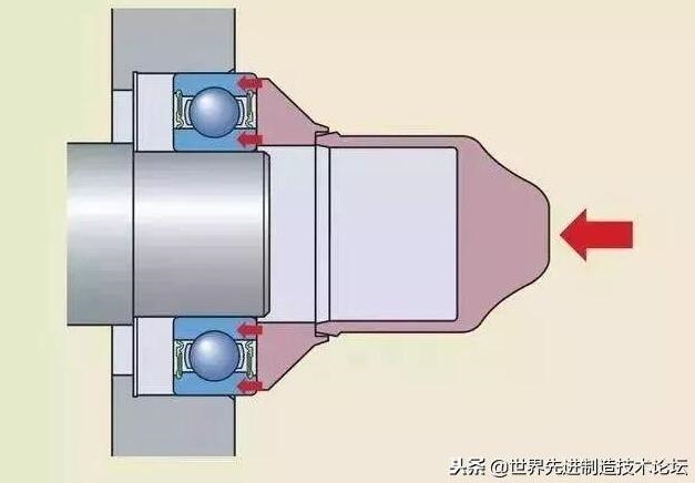 安装内圈过盈配合的轴承时,不能通过外圈和滚动体把力传递给内圈。这会把轴承滚道和滚动体表面敲坏,使轴承在运转时产生噪音并提前损坏。正确的方法应该用套筒直接把力作用在内圈端面上。