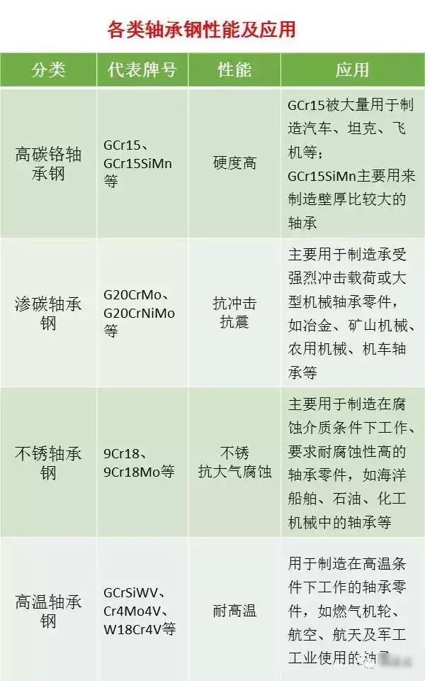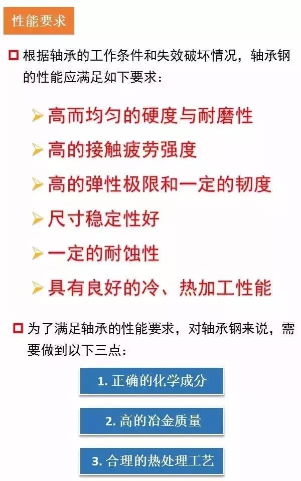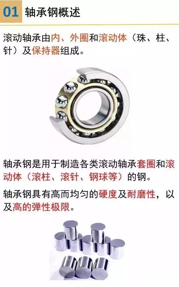 轴承钢是用于制造滚动轴承的滚动体和内外套圈的钢,通常在淬火状态下使用。滚动轴承在工作中需承受很高的交变载荷,滚动体与内外圈之间的接触应力大,同时又工作在润滑剂介质中。因此,滚动轴承钢具有高的抗压强度和抗疲劳强度,有一定的韧性、塑性、耐磨性和耐蚀性,钢的内部组织成分均匀,热处理后有良好的尺寸稳定性。