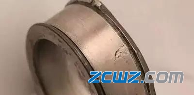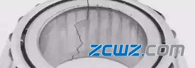 原因:1)冲击负荷过大;2)过盈过大;3)有较大剥离;4)摩擦裂纹;5)安装侧精度不良(拐角圆过大);6)使用不良(用铜锤,卡入大异物)。