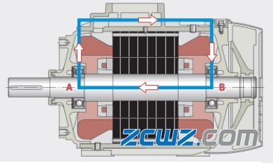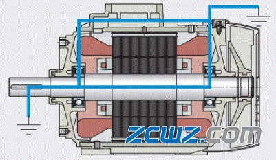 沿轴产生的感应电压会产生同时经过轴承1,轴承座及轴承2的电流回路,图1。这类轴电压产生的一个原因是由于电机内部磁通量分布不均匀,尤其在一些极对数较少的电机中。此时,只要绝缘一端轴承就可以完全切断电流回路。通常绝缘非驱动端轴承。