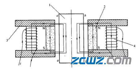图中转子1在永久磁铁2产生的静磁场吸力作用下,处于平衡位置(即中间位置),也称为参考位置。根据结构的对称性可知,永久磁铁产生的永久磁通在转子左右气隙a-a和b-b处是相同的。此时两气隙处对转子产生的吸力相等,即Fa=Fb。假设转子受到一个向右的外干扰,转子将偏离参考位置向右运动,则转子左右气隙大小将发生变化,从而使其磁通变化。左边气隙增大,磁通φa减小;右边气隙减小,磁通φb,增大。由磁场吸力与磁通的关系可知,此时转子所受吸力Fa