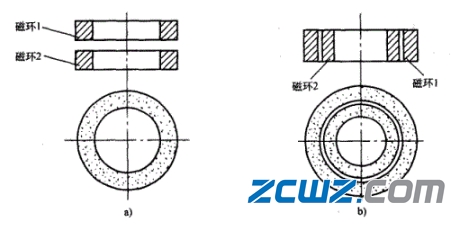 永磁轴承可以由径向或轴向磁化环构成。刚度和承载力可以通过采用多对磁环叠加的方法来增加。如图1-3a所示,当磁环1和磁环2采用轴向充磁,且极性相同装配时构成吸力型径向轴承,按极性相对装配时则构成斥力型推力轴承。如图3b所示,当磁环轴向充磁,且按极性相同装配时构成斥力型径向轴承,按极性相对装配时则构成吸力型推力轴承。如果结合径向磁化情况可构成更多的结构形式。