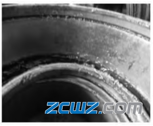 轴承滚道面烧附是轴承金属表面粘附有被迁移的熔融性金属。由于轴承游隙过大或过小、润滑不良或润滑脂中有杂质、擦伤严重引起急剧升温而造成(如图 7)。