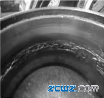 如图5所示,轴承内圈滚道面剥离, 从轴承外观检查中,发现左侧轴承卡滞、异音,经退卸、分解轴承后发现轴承内圈外滚道严重剥离,剥离面积约为30×25mm。