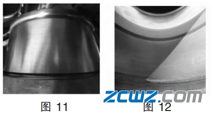 轴承凹痕是由于轴承清洁度不高,内部含有金属或其他杂物造成的。轴承外观检查中,轴承转动异音,经退卸、分解轴承后发现轴承内圈滚道、外圈内滚道均有多处凹痕(如图11、图 12)。