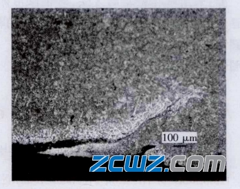 沿垂直于缺陷处进行取样,取样位置见图2,取样大小30mm×15mm×10inn。沿缺陷横截面处制成横向金相试样,用4%硝酸酒精溶液中进行腐蚀。在光学显微镜下放大200倍和500倍进行观察,其缺陷形貌分别见图3和图4。