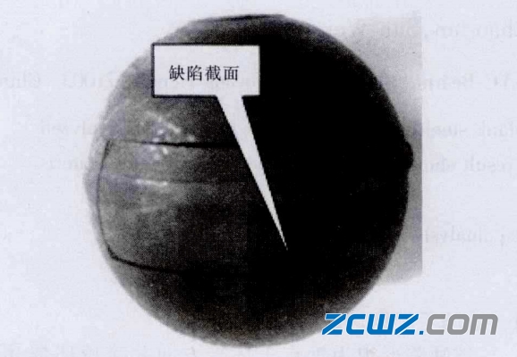 如下图1所示,此轴承钢球缺陷形貌为垂直于环带方向并跨越环带,沿材料流线方向分布;缺陷长度约为26mm。