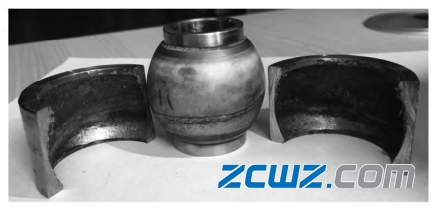如图3、4所示,可见自润滑关节轴承一端球面磨损较严重,已露出金属基体,在轴承内、外圈之间为一层芳纶-聚四氟乙烯纤维织物衬垫,失效轴承的内圈仍可在外圈内随意转动。且内圈磨损球面对应的外圈滑动表面的衬垫已磨损,露出金属基体。磨损均在球面的一端,而另一端球面与衬垫均完好。从球面360°圆周方向观察发现,在球面340°范围内均有磨损。