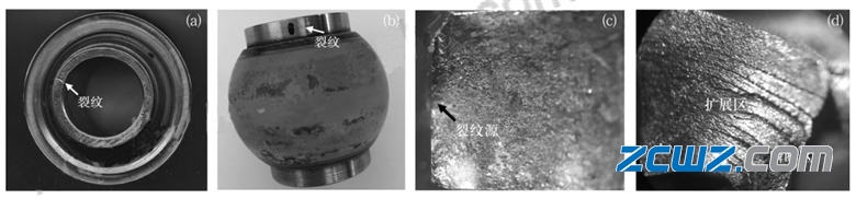 如图5嗾使,轴承内圈断口宏观形貌图,由图5a、5b可知,裂纹处无明显塑性变形,且且沿轴承端面向内部扩展。沿扩展方向人工打开裂纹形成断口试样(图5c),观察该断口发现断面平坦、细腻,具有疲劳特征,其中在靠近内圈端面的断裂面为裂纹源区,如图5c中黑色箭头所指区域。源区为点源,呈灰黑色;源区侧表面(轴承端面)明显可见磨损、辗压特征,磨损方向为周向;整个断口均可见明显的疲劳扩展条纹(图5d)。