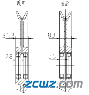 2、改变滑轮结构,增大滑轮厚度,更换轴承:滑轮改进前结构尺寸厚度为61.5mm,配套安装轴承型号为GB/T276-19946217-Z。轴承宽度为28,改进后滑轮尺寸为厚度83mm,配套安装轴承型号为GB/T283-19942217EM,轴承宽度为36。