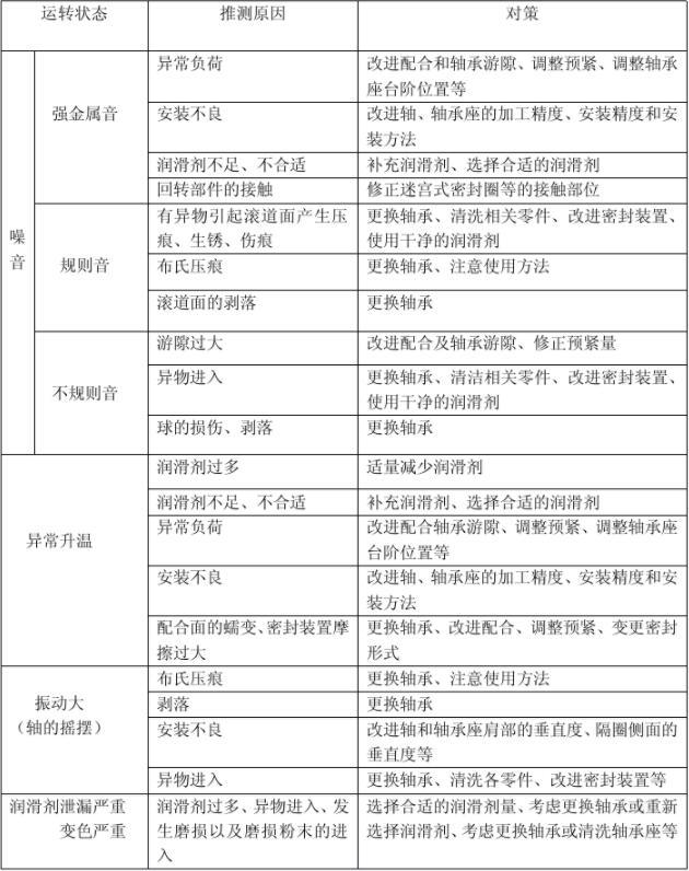 轴承温度从运转开始徐徐上升,通常1-2小时达到稳定状态。如果轴承本身或安装不良,轴承温度会急剧上升,出现异常高温。其原因为润滑脂过多、轴承游隙过小、安装不良、密封装置摩擦过大等引起。如果高速运转,则还有可能是轴承类型或润滑方法有误。