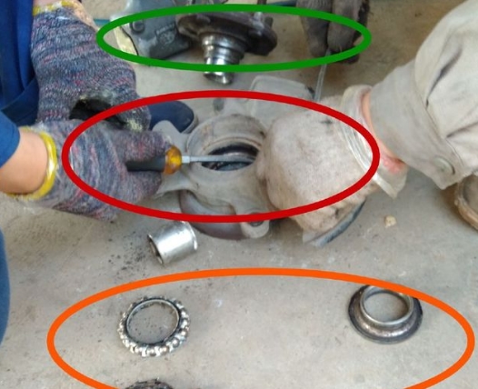 既然轴承有问题,那就开始维修!下图红色区域所示,汽修师傅已经把转向节给拆下了,并且已经用铁锤把轴头和转向节给分开了!但是,折腾人的工作才刚刚开始。轴承的内圆卡在绿色区域所示的轴头上,外圆卡在了转向节内!橙色区域所示的是散开的轴承!