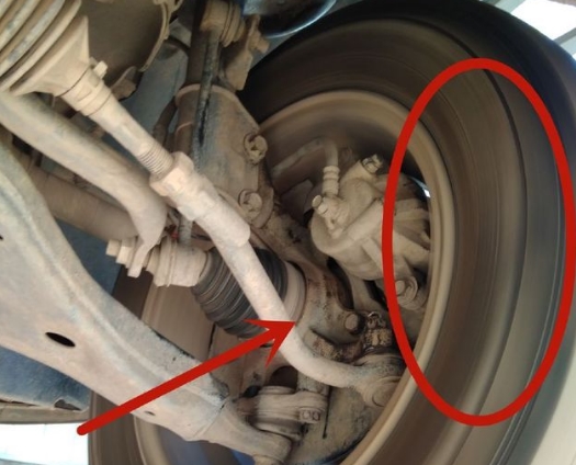 随后,汽修师傅就开始检查问题。汽修师傅把车升起来,然后另一位汽修师傅在车上让轮胎高速转动起来!红色区域所示,轮胎正在高速运转!汽修师傅判断出噪音位置在箭头所示的位置,也就是轴承有问题!
