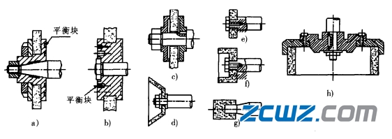 3、图2e)、f)、g)表示内圆磨削用砂轮的几种装夹方法。通常先把接长轴装在砂轮主轴上,然后再把砂轮装到接长轴上。图2g)也是用粘结剂把砂轮黏固在接长抽上,然后装到砂轮主抽上的方法,适用于直径较小(20mm以下)的砂轮。常用的粘结剂为氧化铜和磷酸。粘结时先将粘结剂调成糊状,再注人砂轮孔中,然后把接长轴插人,待自然干燥或烘干使氧化铜硬结后就可使用。把心轴插人砂轮时要注意保持同心和垂直,以免使用时增加砂轮修整时的损耗和发生振抖,影响磨削质量。