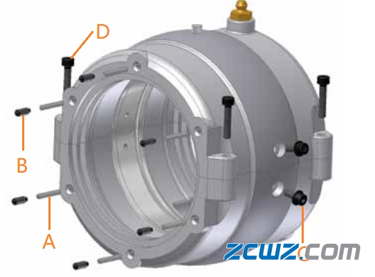 将径向螺栓“C”连同垫圈放入外圈相应的孔中,但不要拧紧。将两半轴承箱连同外圈放在一起,充分拧紧连接螺栓“D”。充分拧紧径向螺栓“C”。带挡边外圈的轴承箱(固定式和特殊型号):将径向螺栓“C”连同垫圈放入外圈相应的孔中,但不要拧紧。将两半轴承箱连同外圈放在一起,充分拧紧连接螺栓“D”。放入侧位顶杆“B”(安装位置)和侧向定位螺栓“A”。之后充分拧紧侧向定位螺栓“A”和径向螺栓“C”(安装位置)。所有类型:将油路注满润滑脂。松开连接螺栓“D”并分开轴承箱,注意,外圈不要从各自半部分轴承箱内滑出。
