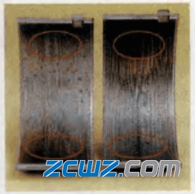 原因:由于轴瓦安装不正确,例如曲轴压在轴瓦边缘,导致轴瓦在轴向上间隙不足。从某种程度上说,引起了摩擦和润滑油膜缺乏,导致温度上升,直到铅从铜合金层上分离,这些区域完全被损坏。