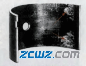 现象:轴瓦边缘和在内表面曲轴高载荷端过度磨损,其他部分正常磨损,在磨损区域,产生熔化和抗摩擦金属合金剥落(如图1所示)。