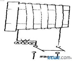 用220V电压时,只要下图所示,将线圈绕在工件表面,绕得密些,绕不下时,可绕多层(各层间串联绕制方向应相反,使总磁通同向),以减少匝间距离,提高加热速度和均匀性。线圈匝数可按要求的磁场强度H,通过公式H=4πWI(圆柱多匝螺旋形感应器)求出。
