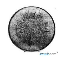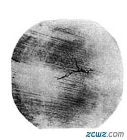 图片6-13 宏观断口上的白点形貌 白点实质是一种脆性锐边裂纹,具有极大的危害性,是马氏体和珠光体钢中十分危险的缺陷。