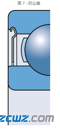 防尘盖和内圈之间有一条小缝隙。带防尘盖的轴承(图 7)适用于相对清洁的工况,或鉴于速度或工作温度考虑必须低摩擦的应用。