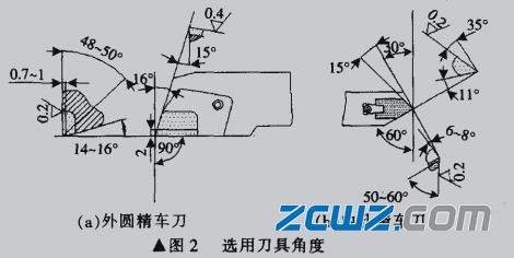 1)切削刀具的选择。轴瓦的原材料一般为铝青铜ZCuA110Fe3,其中主要合金元素Al含量为8.5%~11.0%,Fe含量为2.0%~4.0%,具有高的力学性能。耐磨性和耐蚀性能好,抗拉强度crb≥490MPa,屈服强度s≥l80MPa,伸长率≥13%,是一种易切削合金,可以选择普通的高速钢或硬质合金材料刀具。刀具要保证刃口锋利.可以采用较大的前角和主偏角,刀具各角度的选择见图2所示。