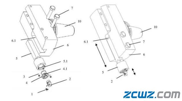 较短的双向箭头所示的微调节方向,即微调节,从而微调镗刀头2以适应不同精度要求的孔。进一步地,调节螺母相对于调节螺母向前伸出的距离在0-5mm之间,进而,多功能镗刀的镗刀头2的微调半径在0-5mm,保证孔的精度偏差不超过0.015mm。