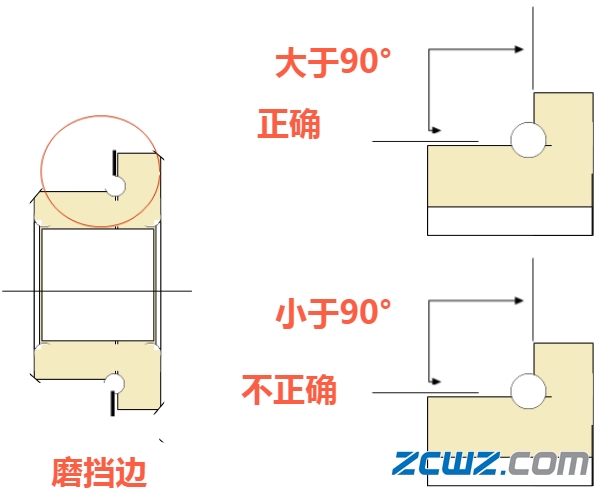 3)挡边面与滚道母线夹角小于90°,降低轴承使用寿命;