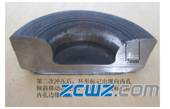 锻孔实验后,环形标记在冲头巨大压力下,有向内孔边缘倾斜移动的迹象,如图6所示。
