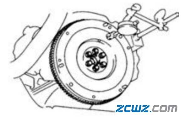 最后检查飞轮端面的圆跳动。将百分表安装在发动机机体上,百分表表针抵在飞轮的最外圈,转动飞轮,测量飞轮的端面圆跳动,应小于0.1mm。如果端面圆跳动超过标准,应修磨或更换飞轮。如图3所示。