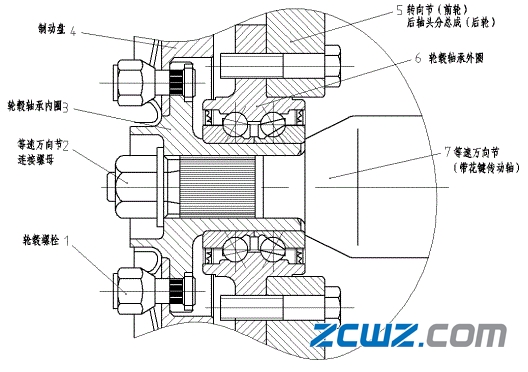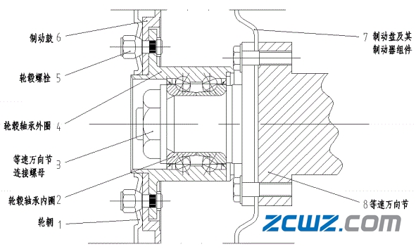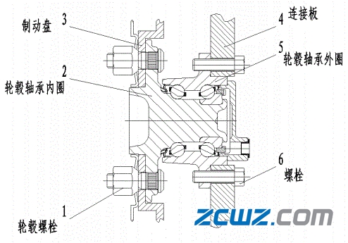 内、外轮毂轴承3外圈与制动鼓5为紧配合,内圈与转向节轴颈(或后轴分头)也为紧配合。轮毂螺栓2通过花键与制动鼓接合并将外面的轮辋-与制动鼓装配成一体。制动盘4与安装于制动盘上制动片以及其他制动器零部件6通过螺栓与转向轴颈(或后轴分头) 1连接。当汽车行驶时,轮毂轴承3外圈跟随制动鼓5以及轮辋内、外轮毂轴承-起旋转,而内圈、转向轴颈(或后轴分头) 1以及装配于之上的制动盘及其组件不旋转,从而保证制动时需要的各种条件。