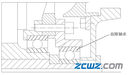 故障轴承内圈一侧端面均存在微动腐蚀现象,该侧端面应是与轴肩配合面,分析认为,轴承工作时轴向力的产生应与该现象的产生有关。从轴承内圈一侧滚道存在偏磨特征与另一侧端面存在微动腐蚀现象来判断,内圈承受轴向力的方向应是从内圈端面无接触痕迹一侧(外侧)向有微动腐蚀一侧(轴肩侧),见图 13 轴承安装部位简图。轴承内圈端面与轴肩产生微动腐蚀的原因多是轴承与轴肩未能充分靠紧,并受到反复轴向冲击力作用的结果,其作用的结果可能使轴承内圈与轴颈发生轴向移动(向外),此时若使轴承不产生附加轴向力,需要轴承外径与轴承座孔的配合有足够的间隙可轴向自由移动,如果轴承外径与轴承座孔的配合偏紧,则轴承外圈在随内圈(向外)移动后就不能自由的回复,在轴承正常工作时使轴承内圈产生一个(向内)的附加轴向力。轴承非打字端面侧白色聚四氟乙烯密封圈内径处有明显磨损,进一步说明轴承轴向力方向是从内圈打字端向非打字端。