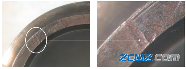 轴承外圈颜色正常,未见高温现象,滚道粘附大量油脂垢,清洗后可见滚道形状基本完整,未见剥落和明显磨损,靠非打字面沟边存在明显卷边现象,仔细观察,滚道接触轨迹偏向非打字面一侧,见图 5、图 6。