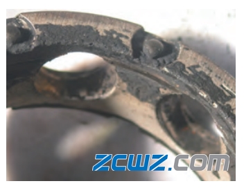 下面我们拿2套使用寿命期满的轴承,同样来剖切外圈进行分解,内、外圈滚道、钢球及保持架引导面和兜孔接触痕迹均正常,编号为 2# 的轴承内圈非打字端面同样存在与故障轴承相似的微动腐蚀特征,见图 11、图 12。
