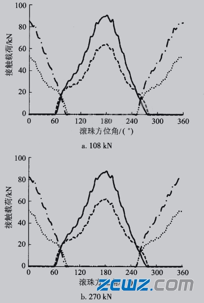 为了分析内、外圈上螺栓预紧力存在差异对滚珠-滚道接触载荷的影响,分别对内、外圈预紧力为150、700kN和内、外圈预紧力为700、150kN这两种情况进行计算,计算结果如图6所示。由图6a可知,内、外圈上螺栓预紧力为150、700kN时,上、下滚道间接触载荷差异相比均布预紧力时增大。在182.15°位置最大,最大接触载荷差值为26694.96N,其最大接触载荷为87039.31N。由图6b可知,内、外圈上螺栓预紧力为700、150kN时,上、下滚道间接触载荷差异进一步增大。在186.49°位置最大,最大接触载荷差值为26991.07N,其最大接触载荷为88612.46N。