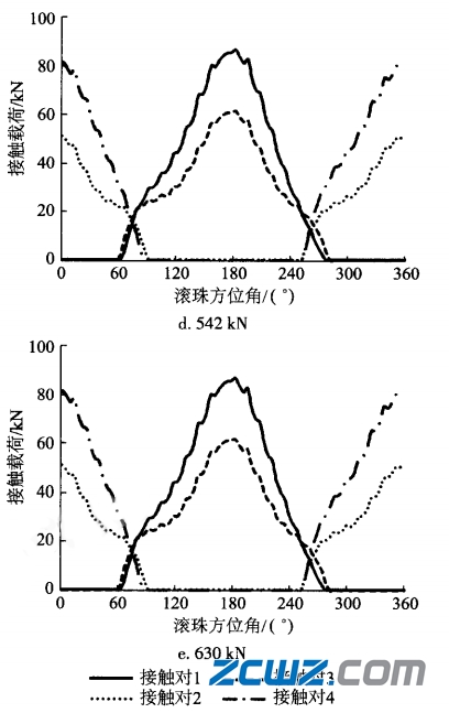 在实际中,常用控制螺栓预紧力的方法均会产生预紧力误差,例如感觉法最大误差可达40%。预紧力误差将导致整个轴承上螺栓预紧力分布不均。为了研究螺栓预紧力分布不均对轴承工作状态下载荷分布的影响,选择如图4所示螺栓预紧力分布(“●”处螺栓预紧力为700kN,“O”处螺栓预紧力为150kN)。对应滚珠-滚道接触载荷分布如图5所示。