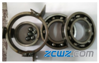 某深沟球轴承在使用中出现轴承滚道剥落现象。某主机用户选用通用型号某深沟球轴承,3套串联安装在粉碎颗粒机压辊上使用一段时间后,发生保持架破裂,钢球散落,内外圈疲劳剥落。见图1-3所示。