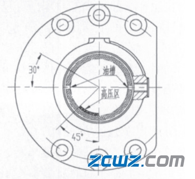 根据凸轮轴三种安装状态的受力分析,选择了一个能同时满足三种安装状态的轴承套油槽布置角度,如图7所示的30°范围的低油压区域,修改有关图纸文件,明确轴承套油槽安装要求。