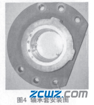 势。我们怀疑是定位套2压紧在轴承座4和轴承套5端面上,封闭了轴承套左边的出油口,致使由A孔进入的润滑油无法顺畅从轴承套左边排出,润滑油发热导致轴承套等烧坏。检查定位套2、轴承座4和轴承套5端面上确实严重的摩擦烧伤痕迹。