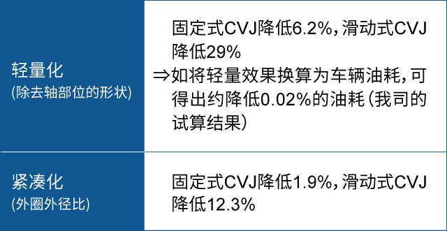 NTN对于分别安装在轮胎侧的固定式CVJ和分速器侧的滑动式CVJ进行了最大作动角的修改,并通过部件的优化设计等使部件薄壁化和小型化,确保在维持必要强度的同时,实现小型、轻量化。