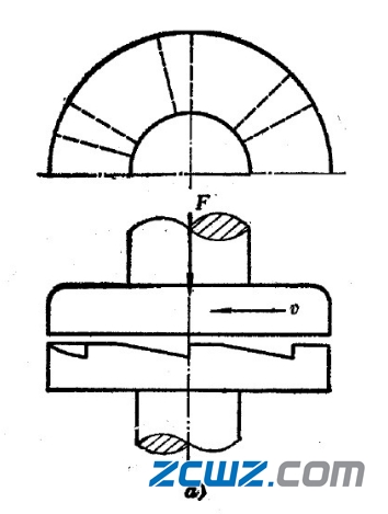 推力滑动轴承的止推面,上开有单方向的楔形倾斜角,楔形顶部有平台。如下图所示,轴为单向旋转,轴向力由推力轴承承受,止推面是固定瓦式的推力轴承。