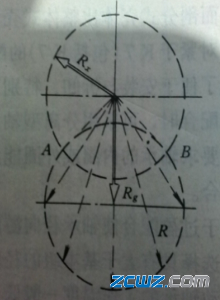 轴承承受一个方向不变的径向负荷Rg,和一个较小的旋转径向负荷Rx,两者的合成径向负荷R,其大小与方向都在变动。但合成径向负荷R仅在非旋转套圈AB一段滚道内摆动,该套圈所承受的负荷性质,即为摆动负荷。
