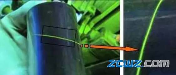 最好采用荧光磁粉进行探伤,使缺陷显示更为清晰、直观。锻造折叠的磁痕一般与表面成一定角度的线状、沟状及鱼鳞片状,如图1所示。