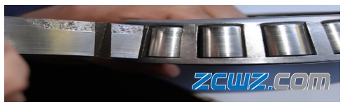 首先,对于滚道破损问题,由于施加载荷为正常通用载荷并无异常,因此可以排除载荷过大原因;由于破损带位于外圈滚道边缘部分,而非全部载荷区,因此排除异物侵入、润滑不良、游隙不当等原因,因为这些原因所导致的滚道疲劳必然是分布于全载荷区或者至少是大部分载荷区。因此,可以初步确定,力矩载荷与旋转不良是致使该轴承外圈滚道破损的主要原因。