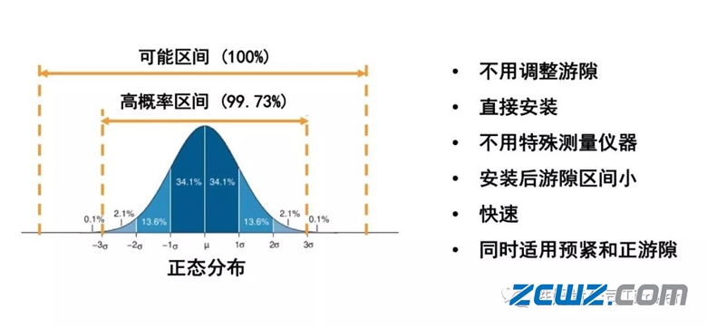 Set-Right使用概率方法并控制相关零件的尺寸公差来确保所有的装配总成中有99.73%的轴承游隙落在可接受的范围内。这是一组随机变量组合后的数学预测,变量就是轴承公差和轴、轴承座等安装组件的公差。