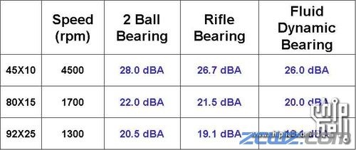 测试数据二:在背景噪音6.7dBA 环境中,把风扇置于离麦克风1.0米处,几款风扇3种轴承的噪音对比。